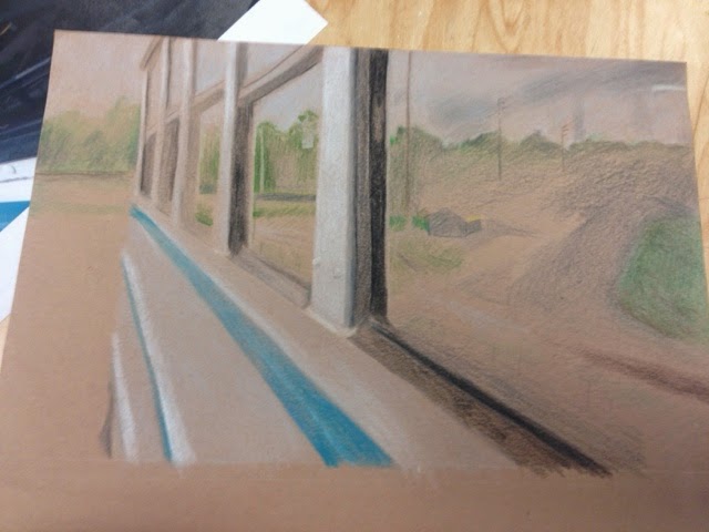 I thought I would never come up with a concept for drawing a reflection that says something about myself. During that class period I thought and thought and could not come up with any ideas. Walking to homeroom that day, I saw the bus window reflection of the track. The stadium and track at Apex high holds so many memories for me from football games to powderpuff to countless track meets. The next day I took several pictures as references and this was my favorite. The hardest part of drawing this was all of the lines. There were so many angles and straight lines that I had to draw to depict the bus. I discovered from this project that my strength is drawing more natural shapes and curved lines. I also had to strengthen a lot of colors that weren't there. For example, the trees in the back were almost black in the picture but I added more green to it in my drawing. I also used A LOT pf layers to make it easier to blend colors and to draw in details later.